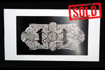 320gsm A3 size card on 5mm foam board with photo that has been covered in hand placed various sized white diamond coloured rhinestones.