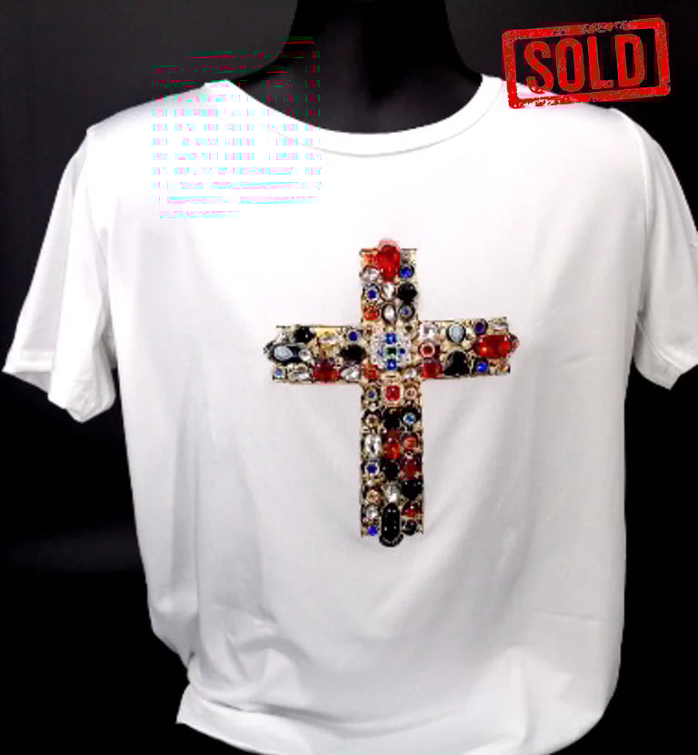This item is ARTWORK. However it is a Black T shirt, 95% Polyester, 5% spandex, chain and gold cross print heavily jewelled with various size and coloured cut glass stones. Size Small. So Please Note: Note: *As these are HUGE stones this golden rule (below) may not apply quite so well. I do advise wearing once then framing this shirt to get the most out of it. It was designed as art not aparel although it IS a T shirt so if you chose to wear it expect to lose a stone or two.