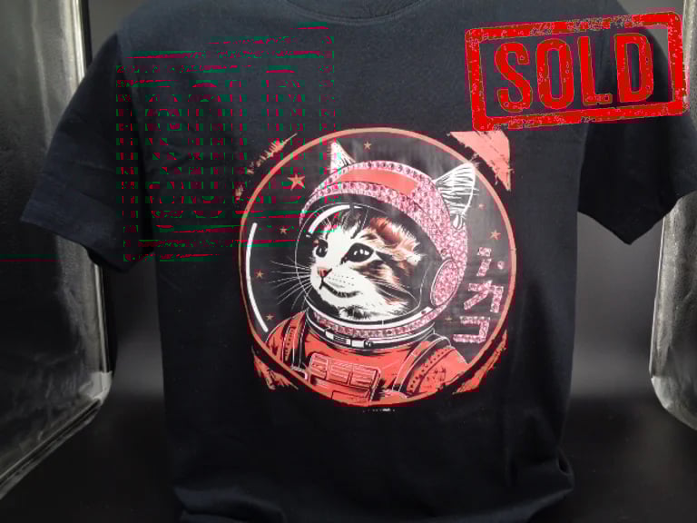 Space Kittens - These items is designed as fun ARTWORK not ready to wear. However, yes it is a Black T shirt, I do advise wearing once then framing this shirt to get the most out of it. It was designed as art not apparel so if you chose to wear it expect to lose a stone of two. See post below for discounted framing. Customised with pink and red rhinestones. Size Small