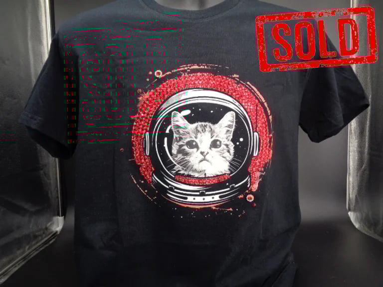 Space Kittens - These items is designed as fun ARTWORK not ready to wear. However, yes it is a Black T shirt, I do advise wearing once then framing this shirt to get the most out of it. It was designed as art not apparel so if you chose to wear it expect to lose a stone of two. See post below for discounted framing. Customised with red rhinestones. Size Medium