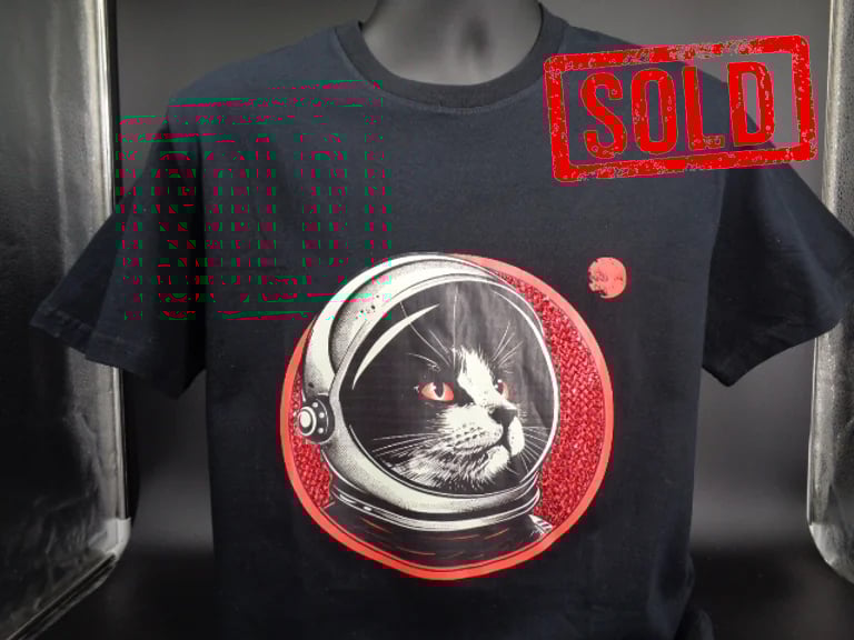 Space Kittens - These items is designed as fun ARTWORK not ready to wear. However, yes it is a Black T shirt, I do advise wearing once then framing this shirt to get the most out of it. It was designed as art not apparel so if you chose to wear it expect to lose a stone of two. See post below for discounted framing. Customised with red rhinestones.Size Large